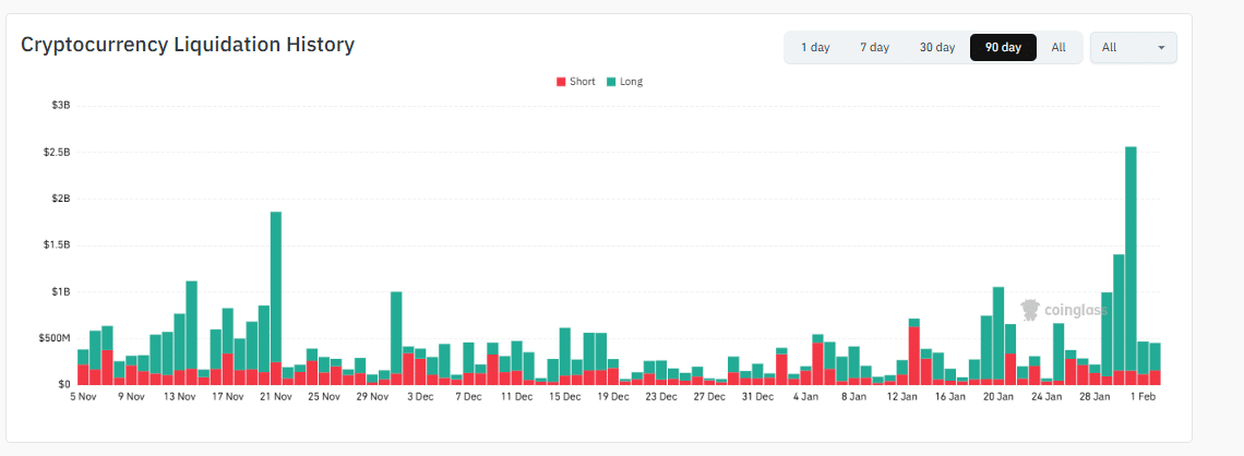 Part of this sell-off was due to forced liquidations. Nearly $2.5Bn has been liquidated in the last five days alone. There was a spike of over $1.68 billion, mostly leveraged long unwinding, on January 31 when prices collapsed. Usually, when prices drop, leveraged long traders are forced to exit by selling; this heaps pressure on the underlying asset since liquidations cascade into the spot market.
