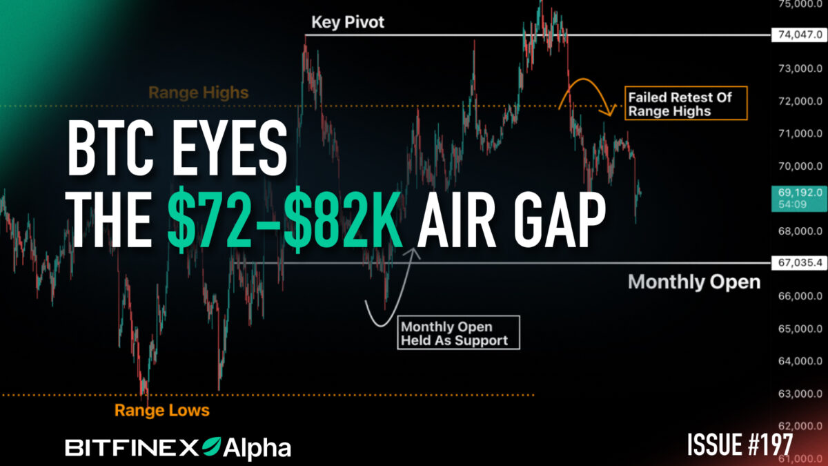 Last week was a game of two halves for BTC, as it rallied to a high of $76,000 on Tuesday only to trade down to almost $68,000 on Sunday as the market responded to PPI data, Fed comments and ongoing tension in West Asia. BTC, however, remains above its March open, in contrast to the volatility seen in the S&P500 index, with potentially clear air above $72,000, if the market has sufficient conviction to get there.