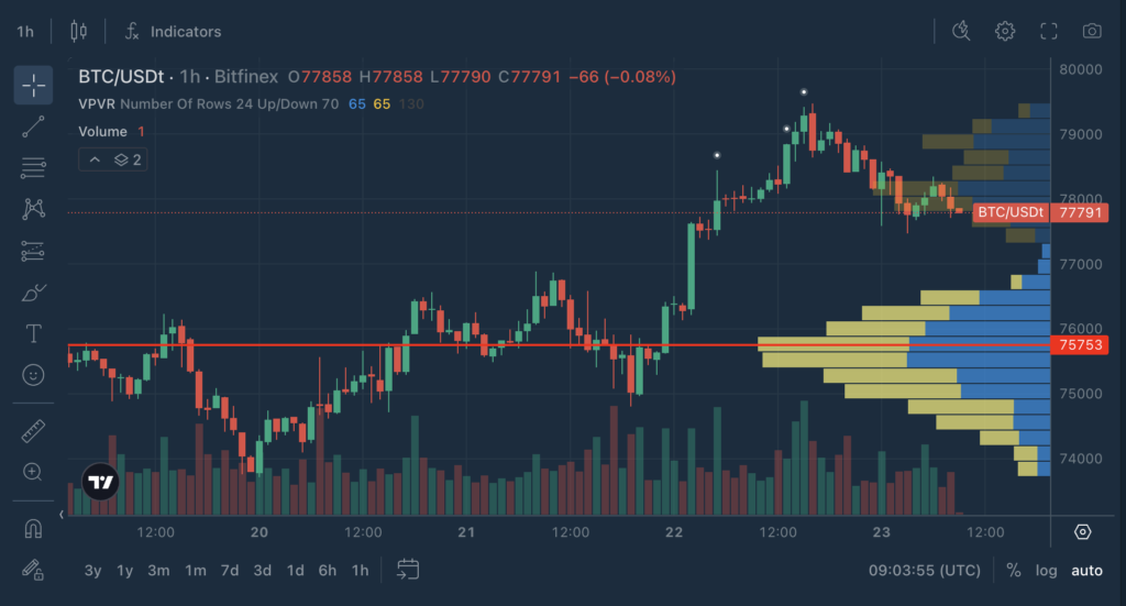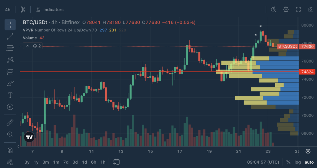 - The POC shifts up to ~ $78,014, reflecting recent trading activity