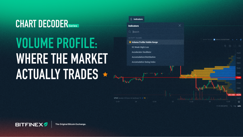 Bitfinex’s TradingView-powered charts give you direct access to the Volume Profile built into the Indicators menu. Search “volume profile” and you’ll see two profile options: Volume Profile Fixed Range and Volume Profile Visible Range.