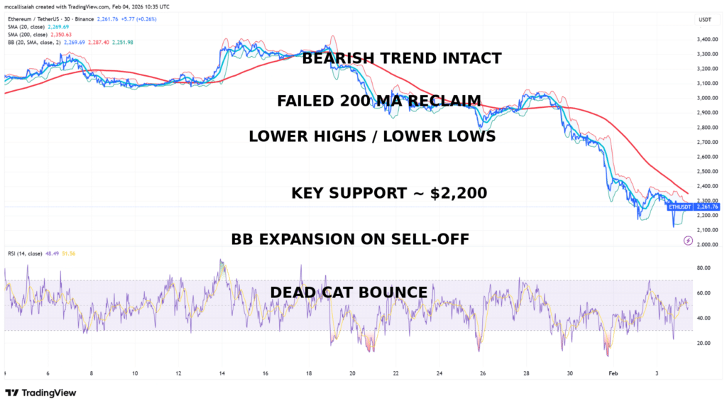 ETH’s chart is textbook bearish: lower highs, lower lows, each bounce weaker than the last. The recent rally looks like a dead cat bounce with support at $2,200, then $2,100.